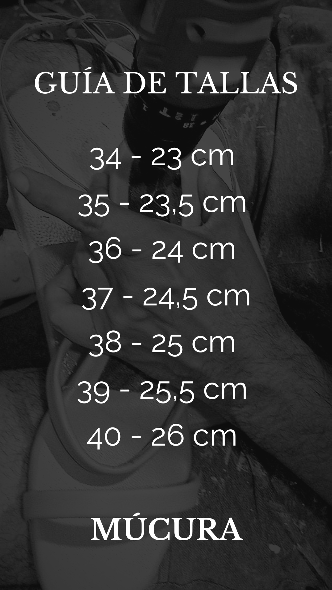 Nuestros modelos están disponibles en tallas 34 a 42, y su horma tiende a ser estándar amplia, por lo que se adapta bien a diferentes tipos de pie.
